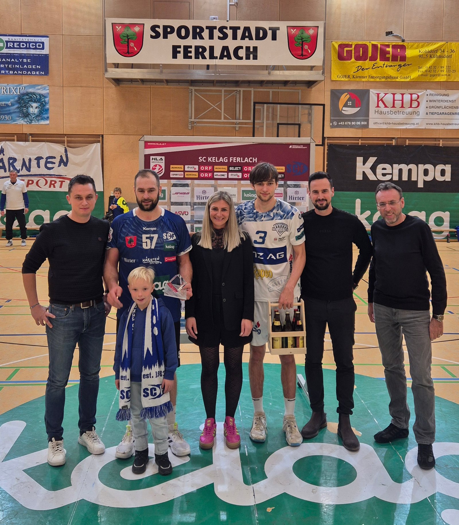 Mit einem 29:28 Erfolg gegen den HC Linz verteidigte der SC kelag Ferlach die Tabellenführung in der HLA Meisterliga. Kapitän Patrik Leban war einmal mehr der Drehpunkt im Angriff der Ferlacher. Seine insgesamt 9. Treffer war zugleich das Siegestor. Die Jury wählte ihn daher zurecht zum Spieler des Abends. Im Bild v.l.: Str. Thomas Laussegger,
