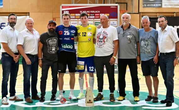 Mit einem 45:36 Erfolg über den UHC Hollabrunn sicherte sich der SC kelag Ferlach den ersten Heimsieg dieser Saison. Die 45 Tore bedeuten auch einen neuen Clubrekord. Flügelspieler Florian Ploner trat dabei mit wunderschönen 8 Treffern besonders in Erscheinung. Einstimmig wählte ihn die Jury zum Spieler des Abends Im Bild v.l. Hannes Valentin, Herwig Pluder,