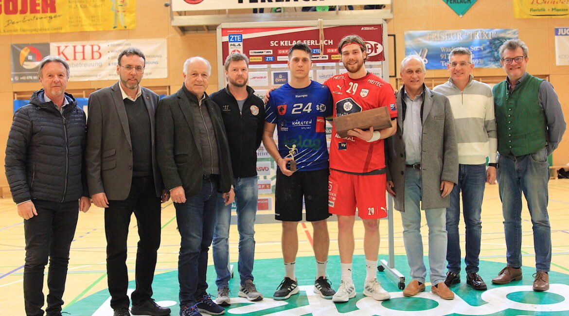 Für seinen Einsatz und seine Wurfleistung (er warf acht Tore) kürte die prominente Jury – von links SCF-Präsident Franz Wutte, Vizebürgermeister Christian Gamsler, Bürgermeister Ingo Appé, ESV Ferlach-Kapitän Wolfgang Kopeinig, Mladan Jovanovic, Julian Pratschner (Krems), GR Sven Skjelett, Dr. Ernst Benischke (GF Deutsch Ordens-Krankenhaus Friesach) und KHV-Präsident Dr. Johannes Meleschnig – Mladan Jovanovic zum „Spieler des Abends“.