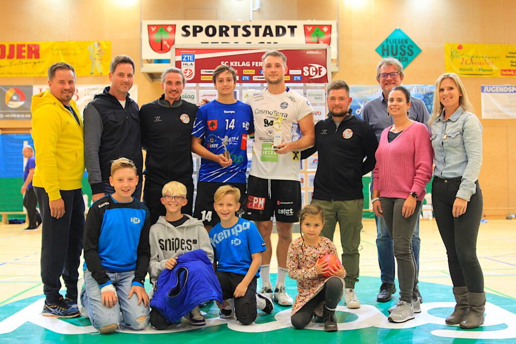Für seine sechs wichtigen Tore kürte die Jury – von links , Gojer-GF Oskar Preinig, die beiden ESV Ferlach-Asse Thomas Ogris und Dominic Thalhammer, KHV-Präsident Dr. Johannes Meleschnig sowie die ehemaligen SCF-Handballerinnen Katrin Röttig und Jutta Ebner mit Nachwuchsspielern – Mathias Rath (in der Bildmitte mit dem besten BT-Spieler Christoph Neuhold) zum „Spieler des Abends“.